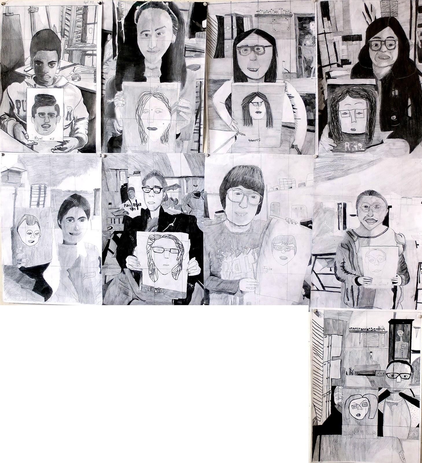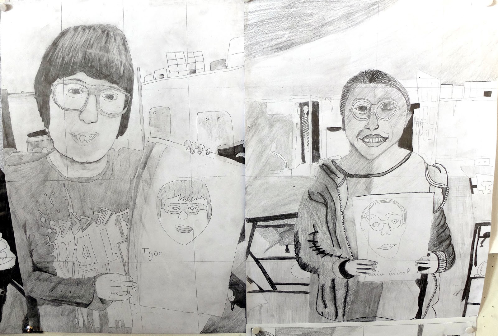 Trabalhos a grafite explorando os valores luminicos e procurando entendimento da orientação da luz e modelação de superficies. Aplicação de grelha de ampliação para transferência de imagem.