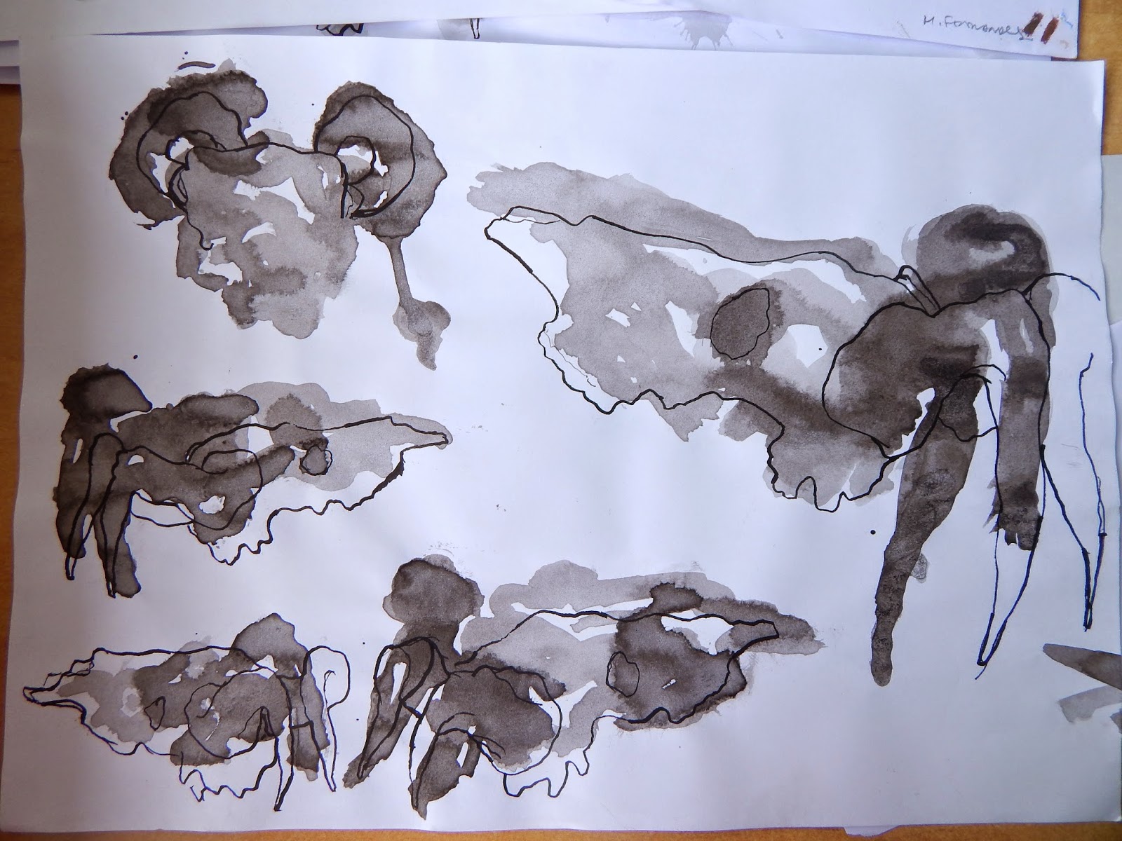 Trabalho final A0 em papel de cenário- tinta da china, aparo de cana, aguarela, tinta acrílica branca e grafite